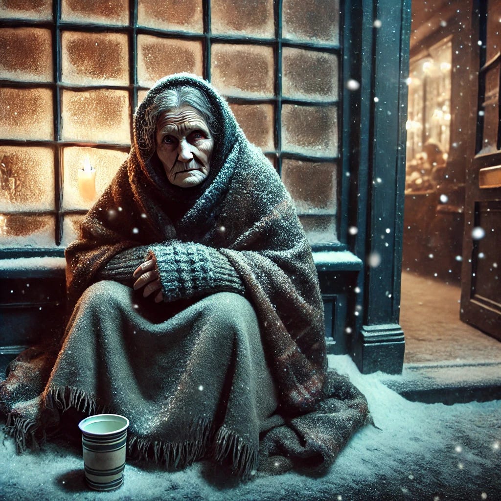 For a privileged elite there are mansions like palaces, limousines, designer clothes, and obscene displays of opulence while, at the same time, poor people are living on the streets with not enough food to eat. And not just living on the streets but dying there too on these bitterly cold winter nights.